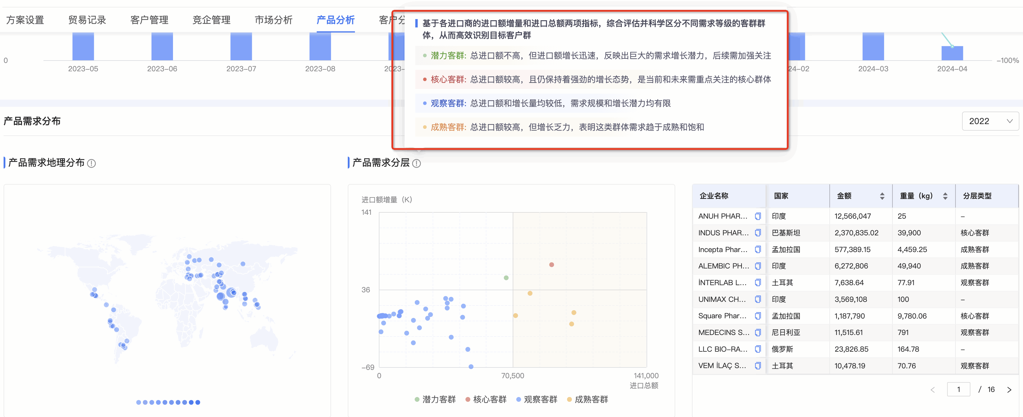 ● 产品需求分层图:EVO视讯 EVO真人数据通将需求客群按照进口额增量和总额进行分层,划分为潜力、观察、成熟和核心四个层级。分层有助于用户快速锁定目标客户群体。标题旁附需求分层的解读,能让用户更直观、快速理解每个层级的特征,能够更快速的识别目标客群。